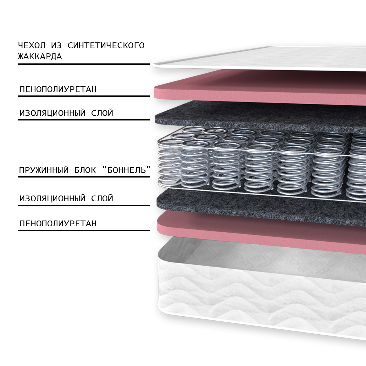 В данной модели использован пружинный блок "Боннель" - классика матрасного производства. Система пружин, соединенных между собой в определенной последовательности, при эксплуатации не соприкасаются друг с другом, благодаря чему конструкция абсолютно бесшумна. Пенополиуретан в составе матраса является гипоаллергенным, влагоустойчивым материалом, выдерживает сильные и продолжительные нагрузки. Придает матрасу мягкость. Обладает достаточно высокой упругостью и эластичностью. Войлок абсолютно экологичный и безопасный для здоровья материал. Войлок изготавливают из шерсти путем уплотнения. Использование войлока в качестве наполнителя повышает ортопедический эффект матраса. Обладает высокой прочностью и долговечностью. Он устойчив к истиранию и прослужит два-три десятка лет. Чехол матраса выполнен из хлопкового стеганного жаккарда, что говорит о прочности, плотности и износостойкости чехла.