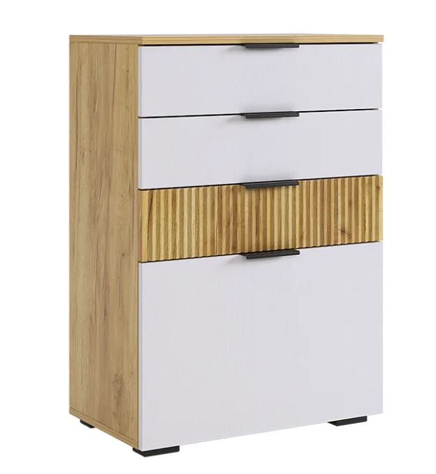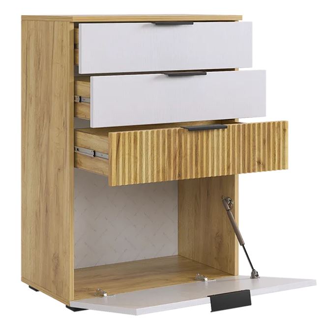Комод "Бери" - модный и стильный предмет мебели, который представляет собой функциональное и практичное решение для разных помещений. Состоящий из трех вместительных ящиков и нижней откидной барной секции, комод "Бери" отличается компактными размерами (350 мм глубины), при этом обладая достаточным объемом для хранения различных предметов. Комод может быть удачным дополнением для гостиной, спальни, прихожей, детской комнаты или кабинета. Особым акцентом комода является фасад ящика из МДФ с вертикальной фрезеровкой "Вельвет".