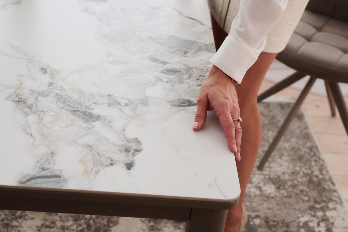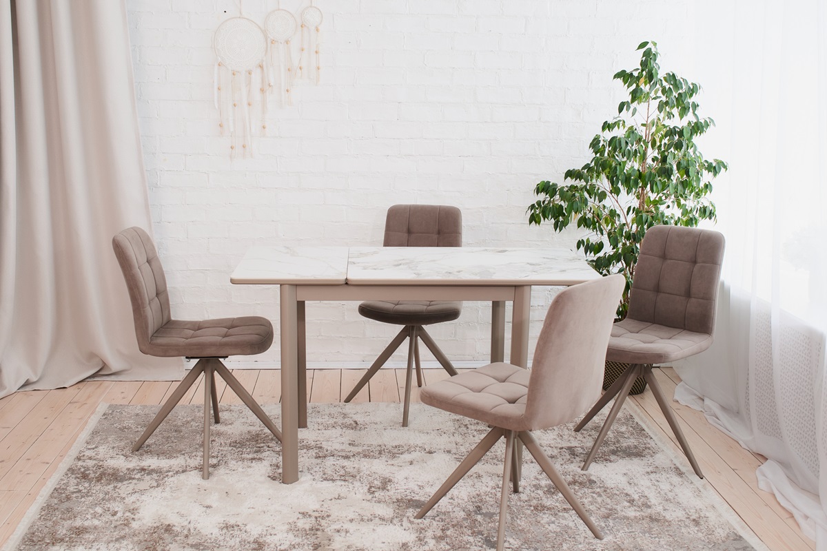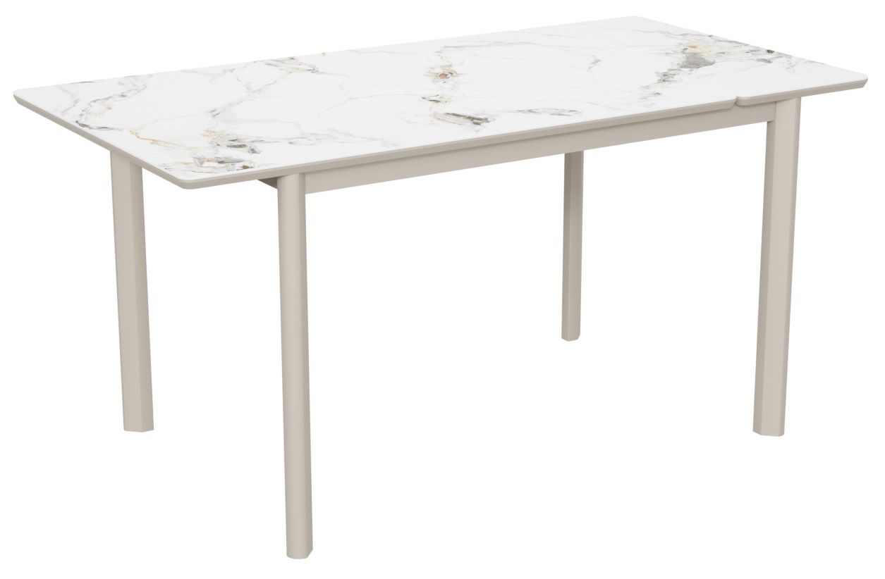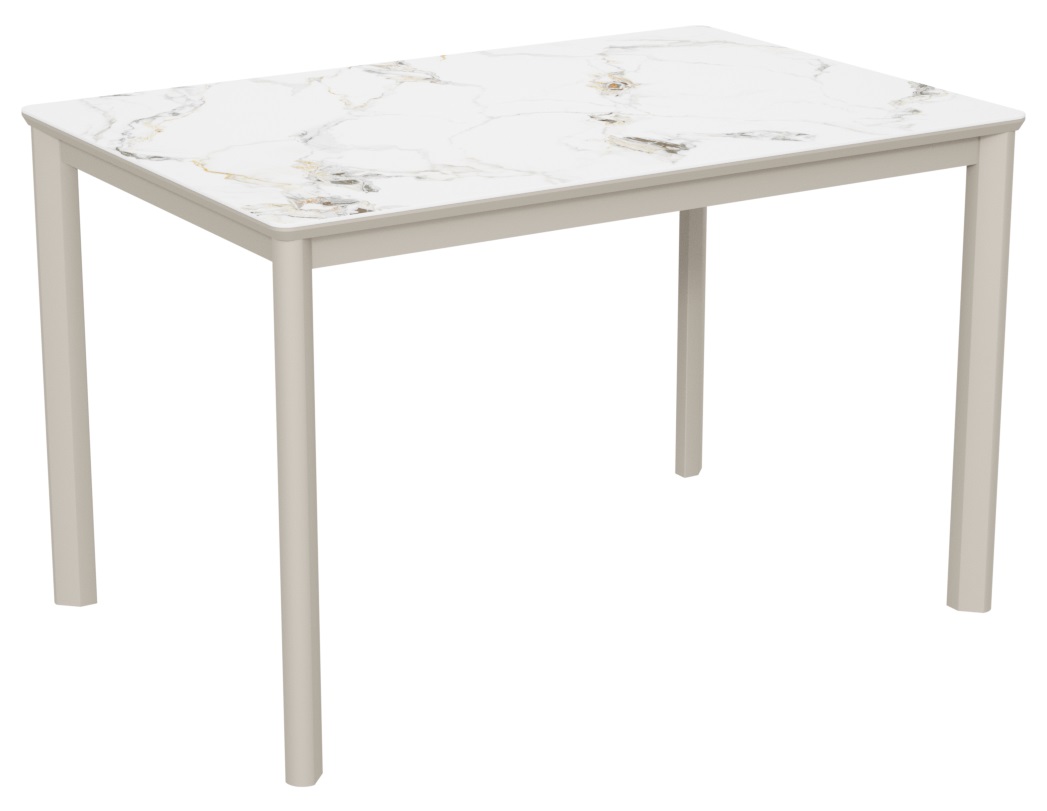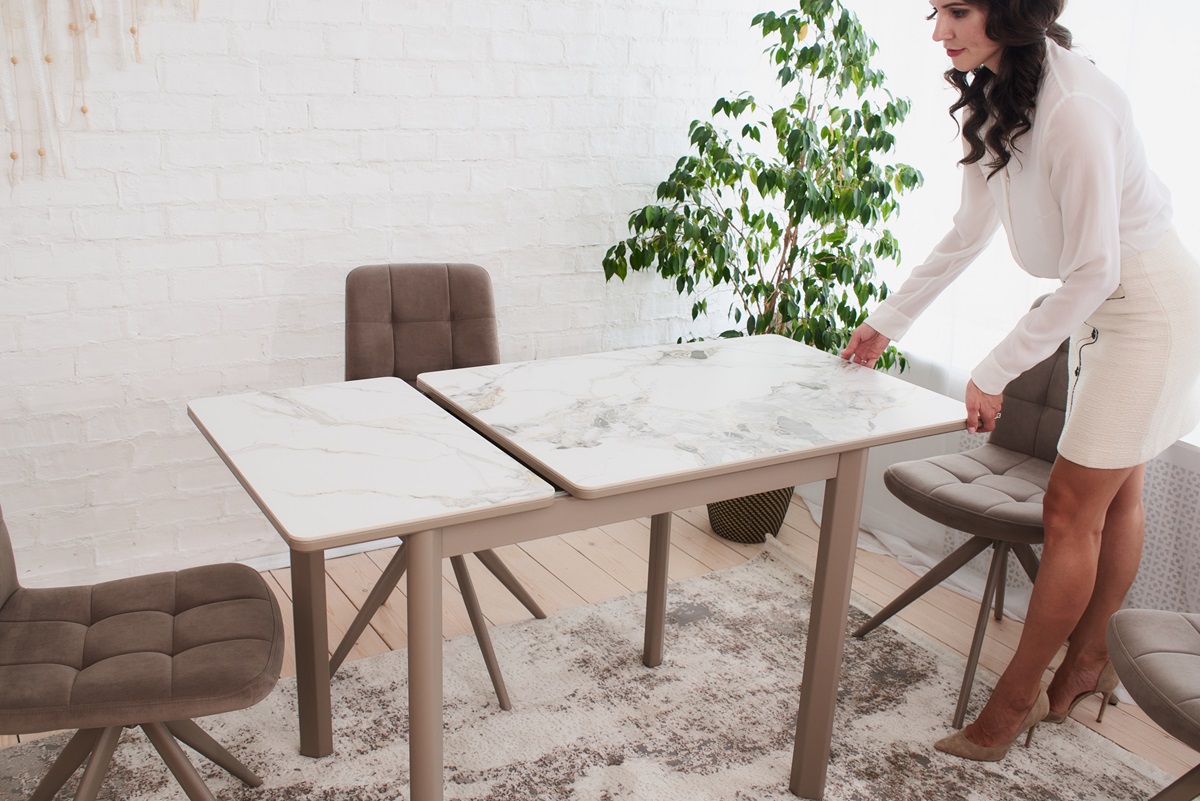 Модель представляет собой прямоугольный стол на четырех металлических опорах с керамической столешницей и механизмом трансформации.