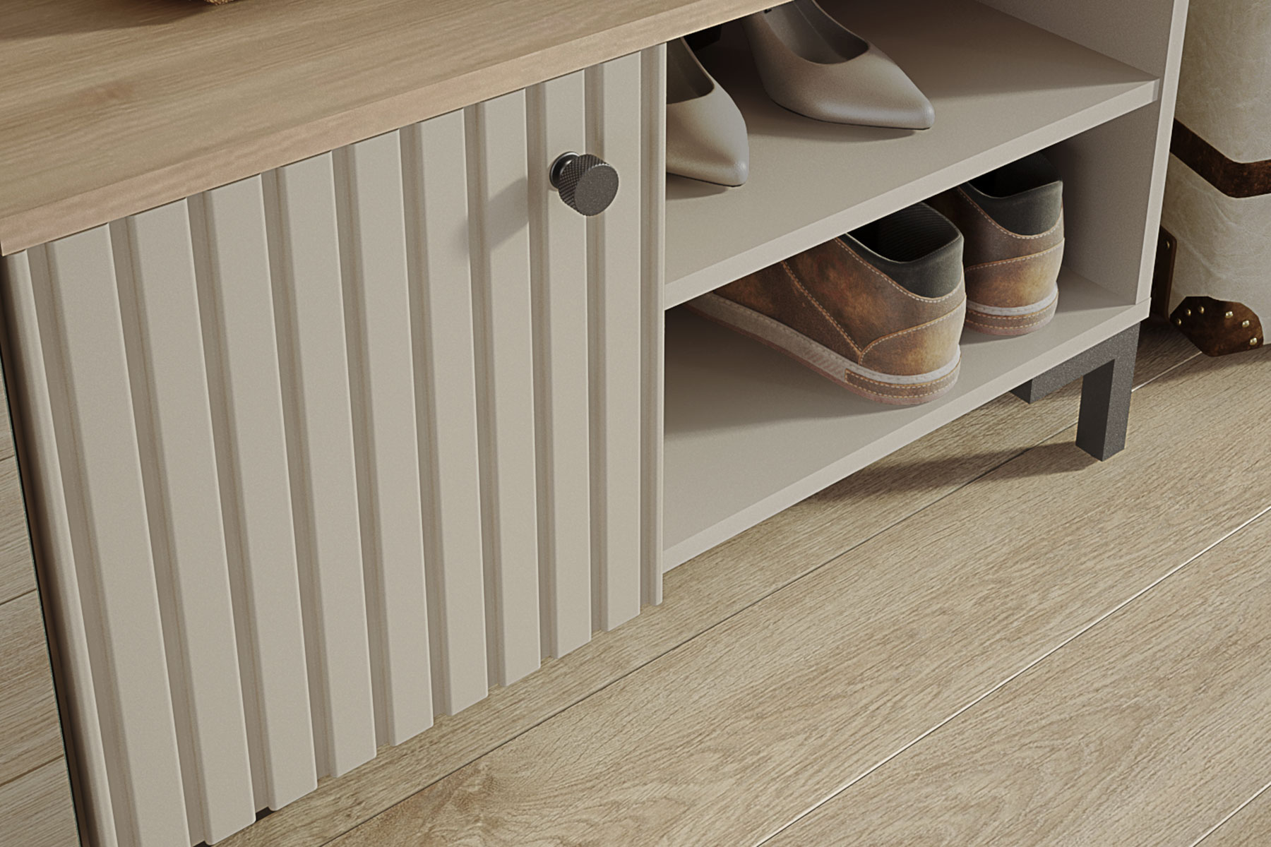 Материалы: Корпус из ЛДСП 16 мм с защитными кромками ПВХ и ABS. Фасады из МДФ 19 мм с тактильно приятным покрытием Soft Touch.
