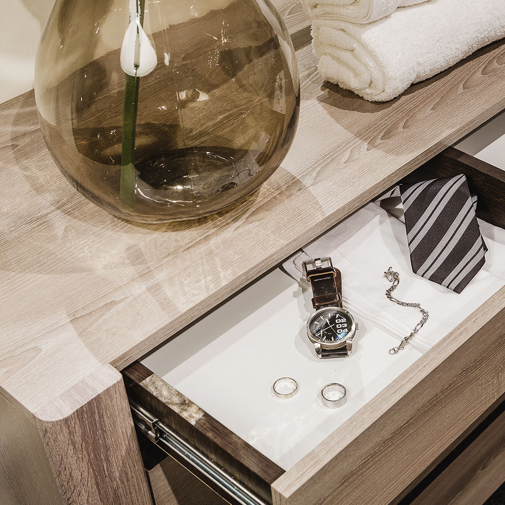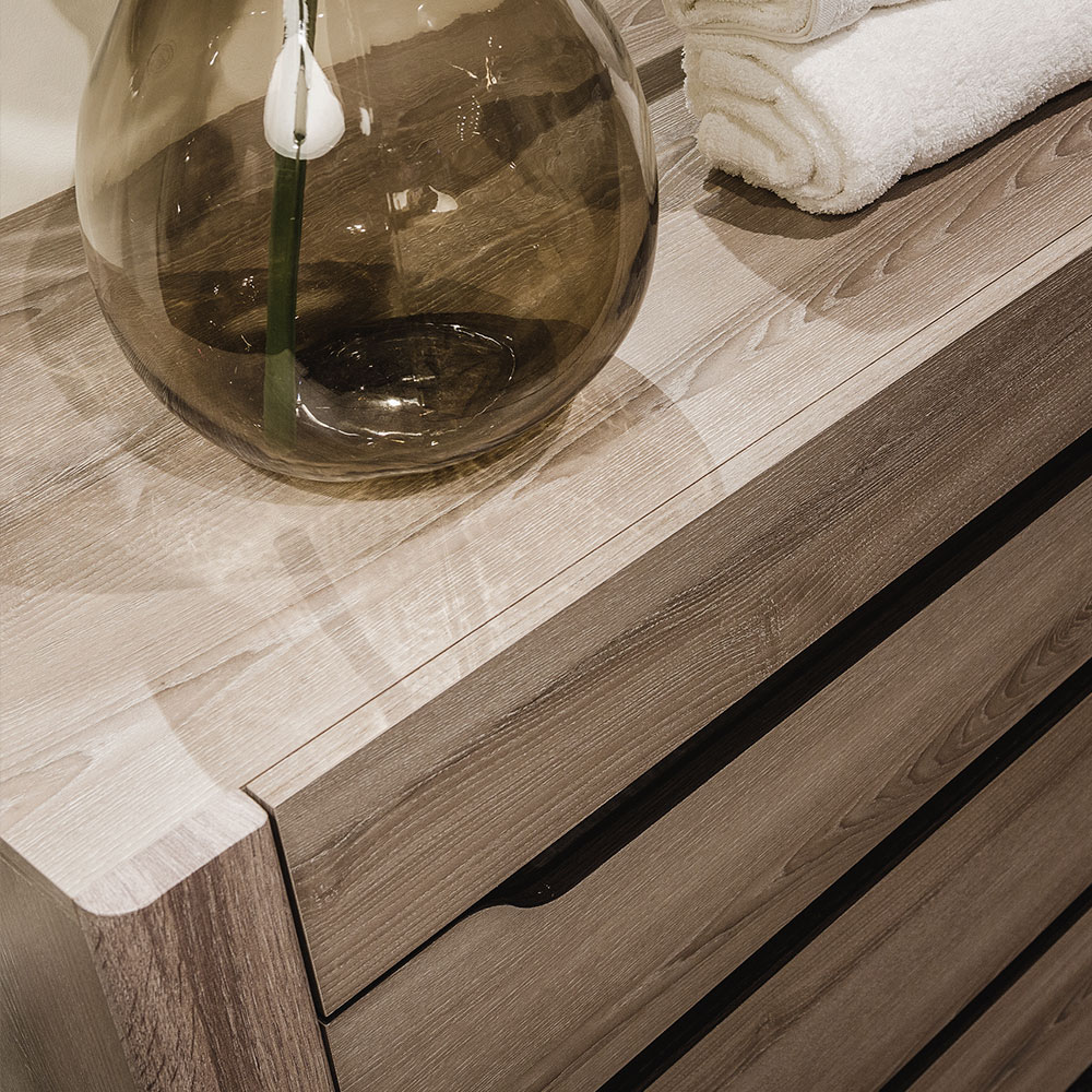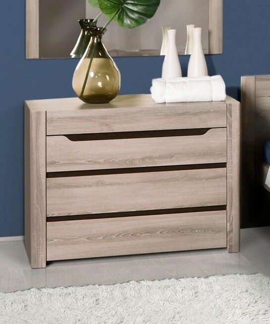Комод "Афина" отличается компактными размерами, простым и функциональным дизайном. Универсальная модель для домашнего интерьера привлекает стильным минимализмом, натуральными крафтовыми оттенками и отсутствием декора и привычных ручек. Комод имеет четыре ящика на шариковых направляющих полного выдвижения, что делает его максимально удобным в использовании.