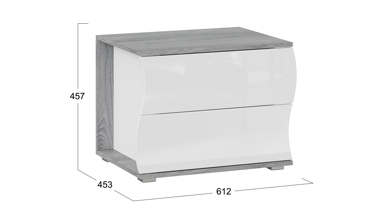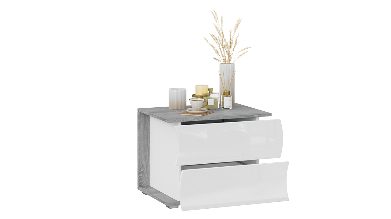 Тумба прикроватная состоит из двух выдвижных ящиков на шариковых направляющих. Ящики открываются методом захвата рукой.