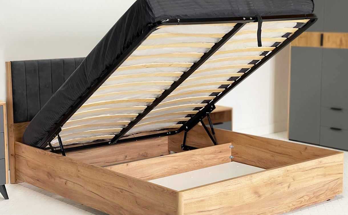 • Подъемный механизм и бельевой ящик: Удобный подъемный механизм открывает доступ к просторному отделению для хранения постельного белья, подушек, одеял и сезонных вещей. Экономия пространства без ущерба для комфорта.