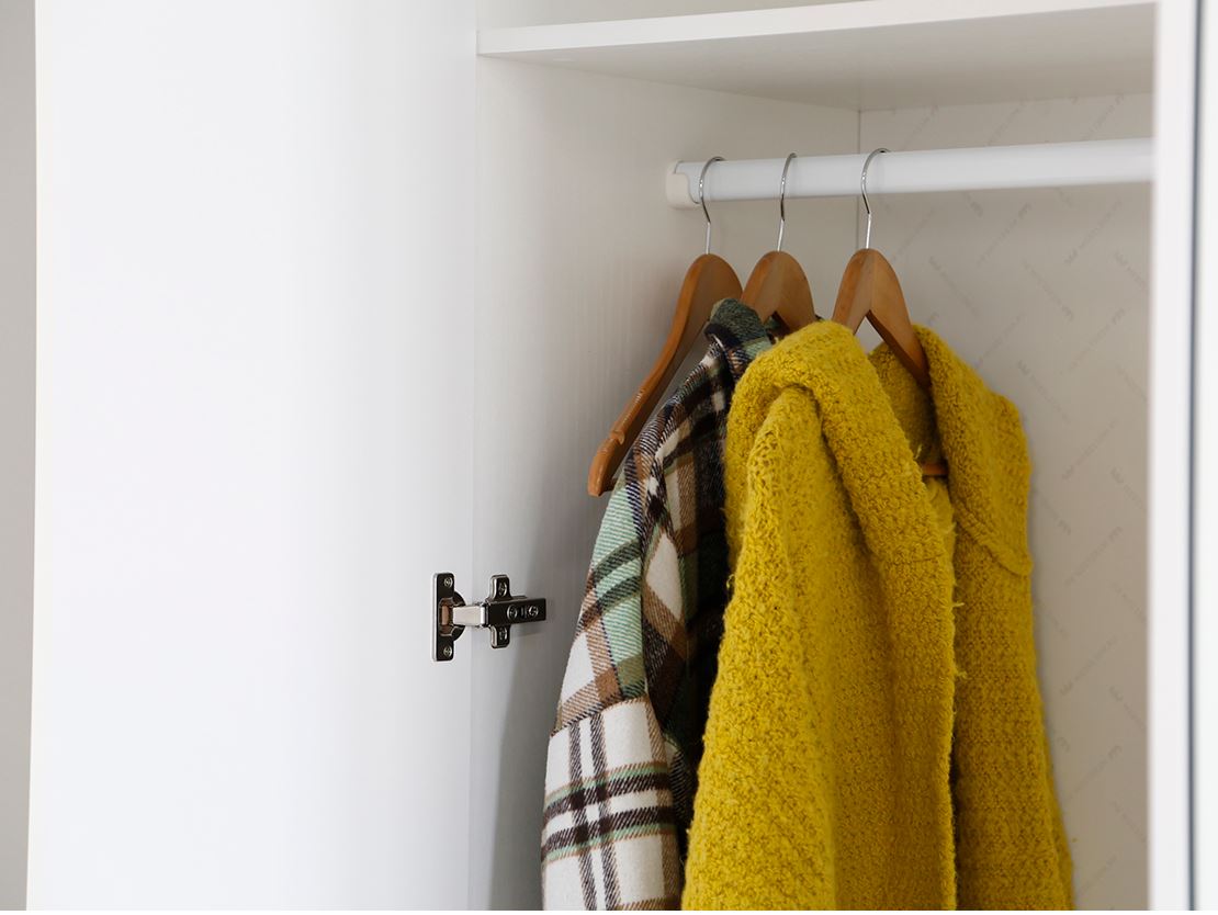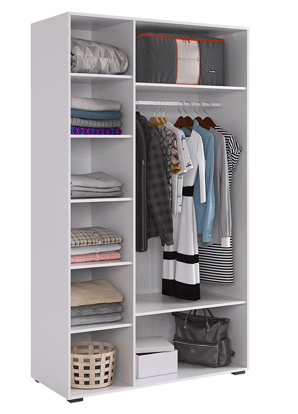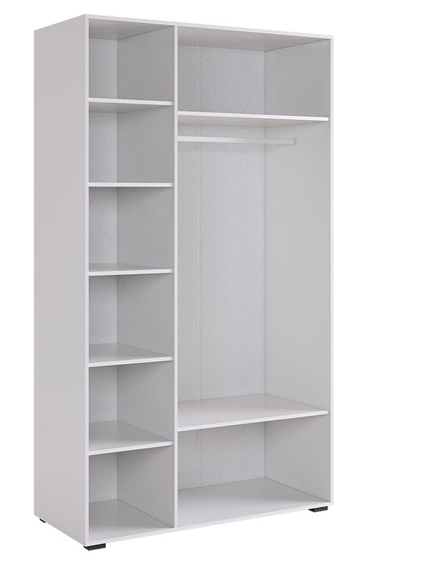 • Левая секция: Штанга для одежды на плечиках + две полки для аксессуаров или сложенных вещей.