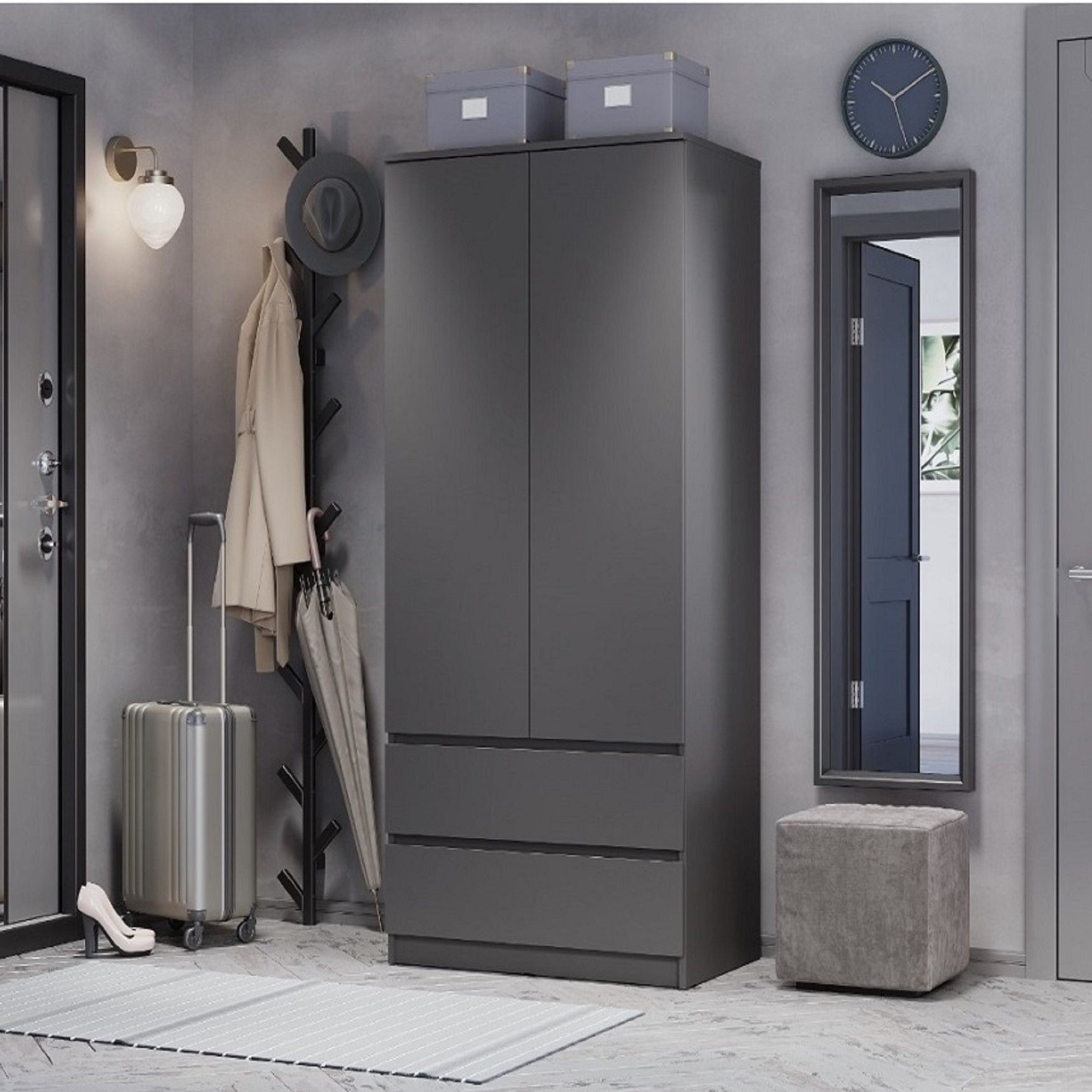 • Продуманное хранение: внутри расположена штанга для верхней одежды и два вместительных ящика на плавных шариковых направляющих.