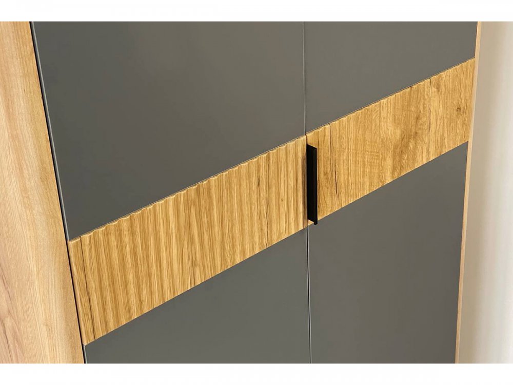 • Декоративный элемент на фасаде из МДФ с фрезеровкой «вельвет» — изысканная текстура, которая привлекает внимание и делает шкаф уникальным.