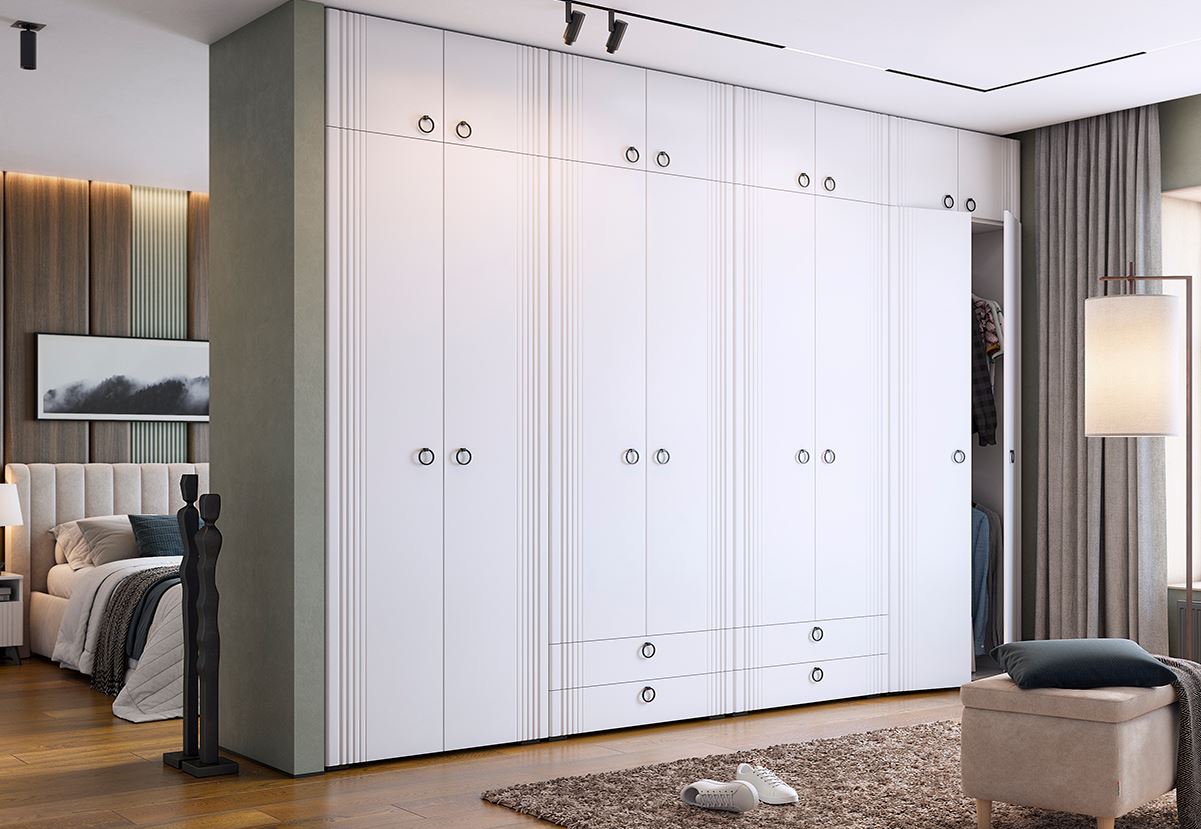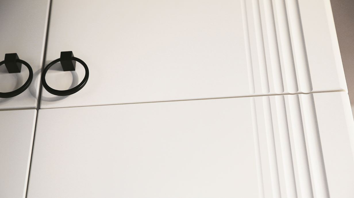 Фасад из МДФ с матовым белым покрытием ПВХ украшен вертикальными фрезерованными полосами — это придает антресоли изысканную текстуру и современный вид.