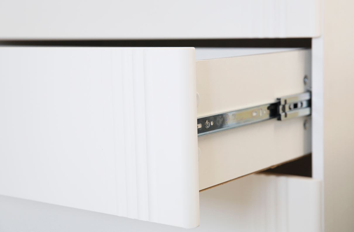 Фасад из МДФ с матовой белой ПВХ-пленкой украшен вертикальными фрезерованными полосами, которые придают шкафу изысканную текстуру.