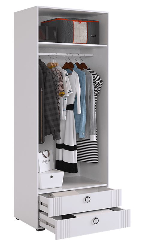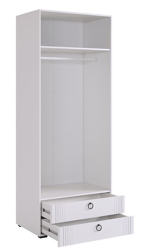 Шкаф «Ева» 103.01 — это функциональное и стильное решение для спальни, прихожей или гардеробной. При ширине 80 см модель предлагает продуманное внутреннее наполнение: две секции для одежды разного типа и два удобных выдвижных ящика для аксессуаров. Лаконичный дизайн с вертикальной фрезеровкой на фасадах впишется в любой интерьер.