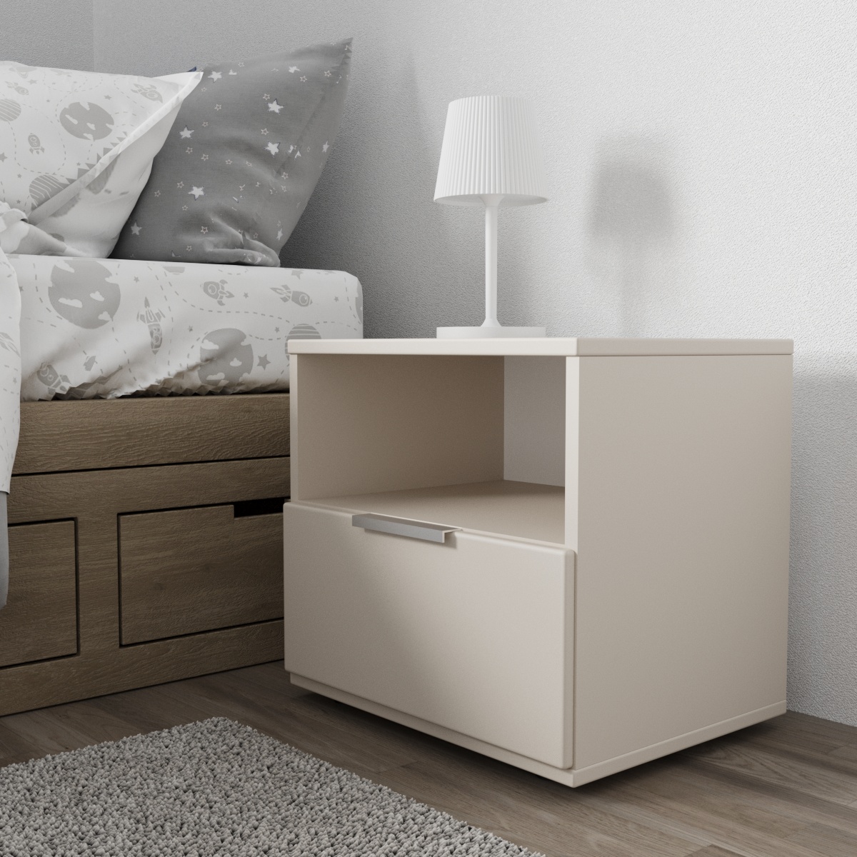 Утонченная тумба с выдвижным ящиком создаст гармоничный акцент в вашей спальне. Модель выполнена в теплой гамме "Кашемир/Дуб Латте" - нежное сочетание фактур создает особую атмосферу уюта.