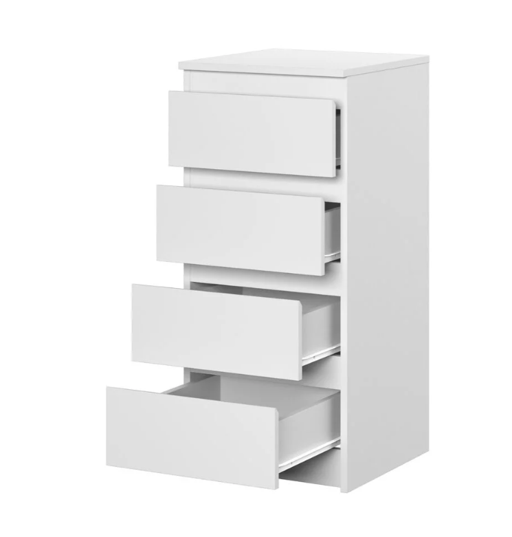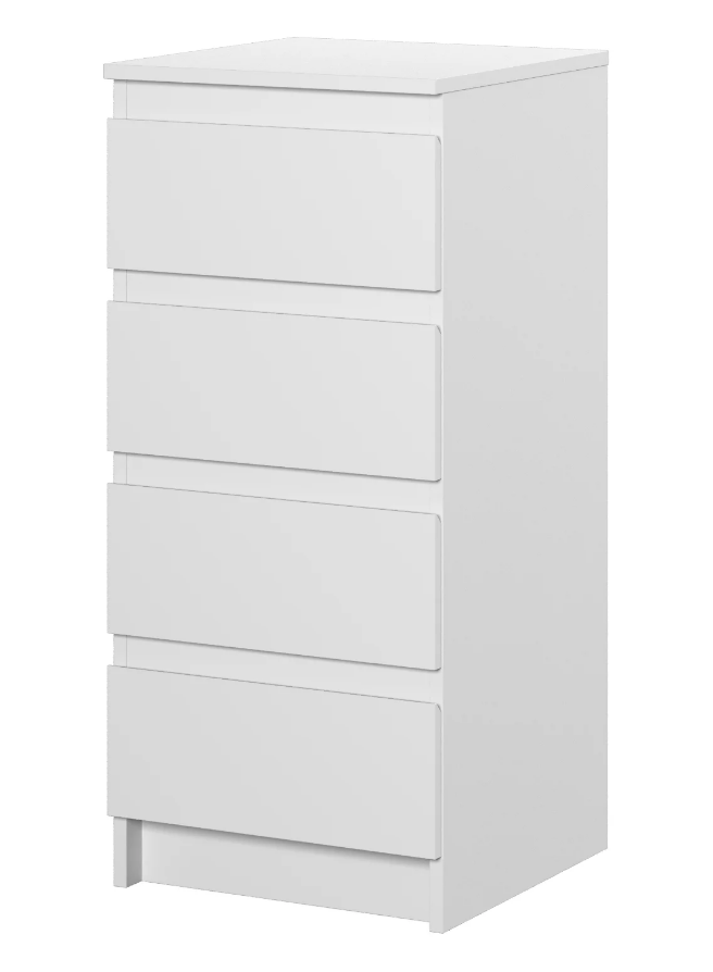 Лаконичный современный комод в белом оттенке. Эффектный цвет фасада и минималистичная элегантность сделают эту модель уместной и в классической, и в современной обстановке. Конструкция включает в себя четыре вместительных ящика на роликовых направляющих. Особенностью комода являются скошенные ручки на ящиках.