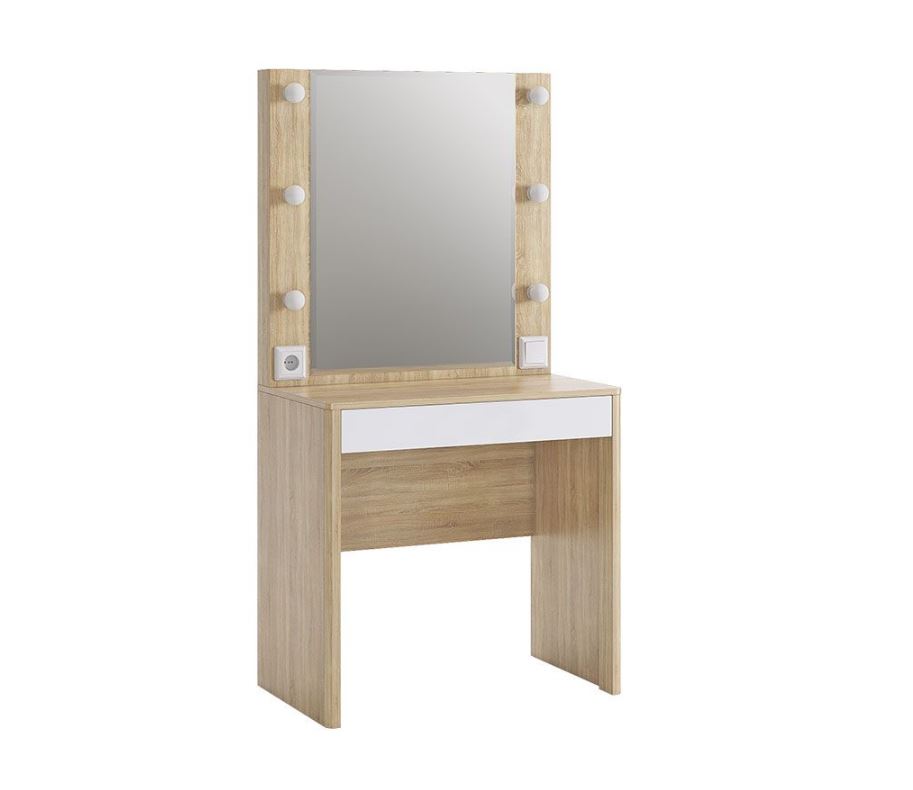 Оригинальное и стильное трюмо из серии «Зара». В зеркало с широким фацетом, встроена подсветка c 6 лампочками, как в столах профессиональных визажистов. Дополнительно имеется выключатель, розетка для фена и выдвижной ящик для украшений и косметики. Закругленные углы, подчеркивают общий стиль коллекции.