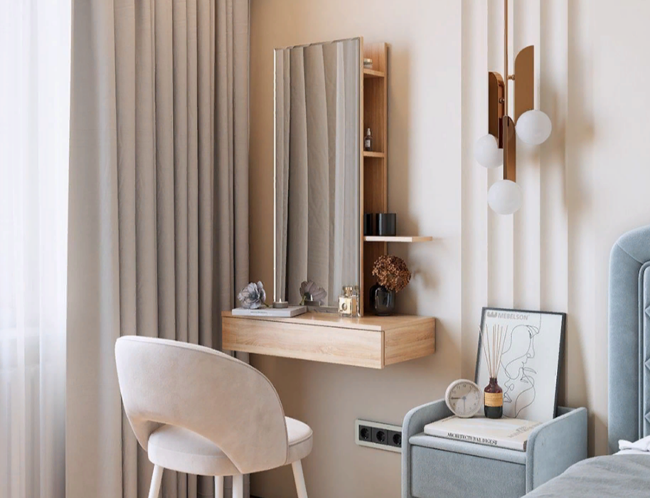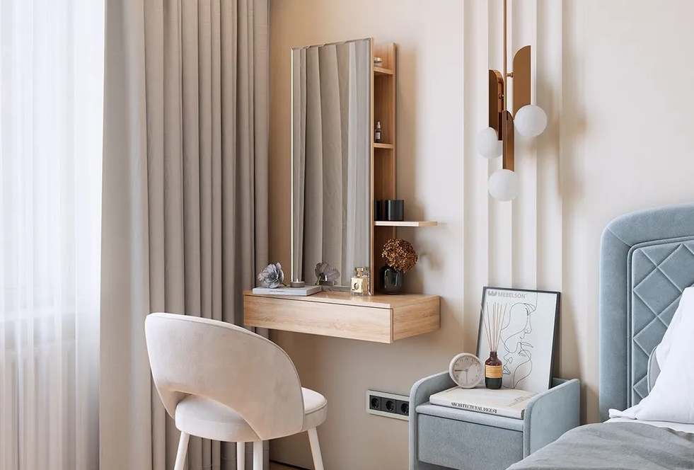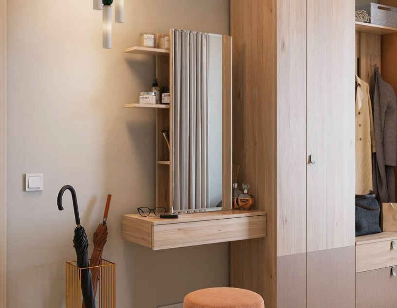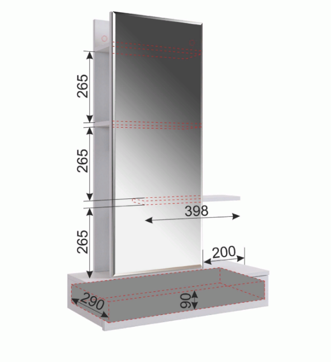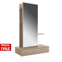 Сборка у трюмо универсальная. Зеркальную панель с полками можно установить ближе к левому либо ближе к правому краю. Так же полки за панелью крепятся в разных положениях.