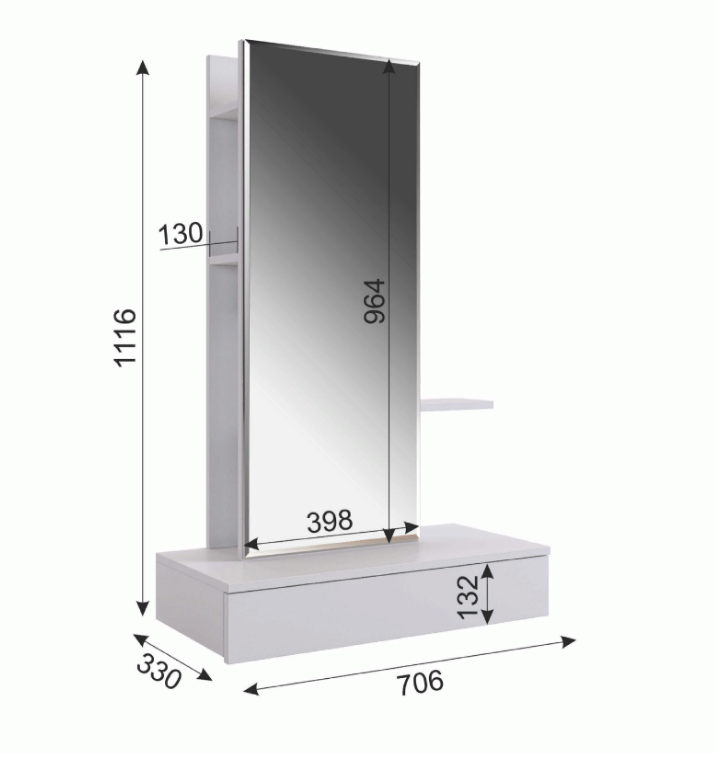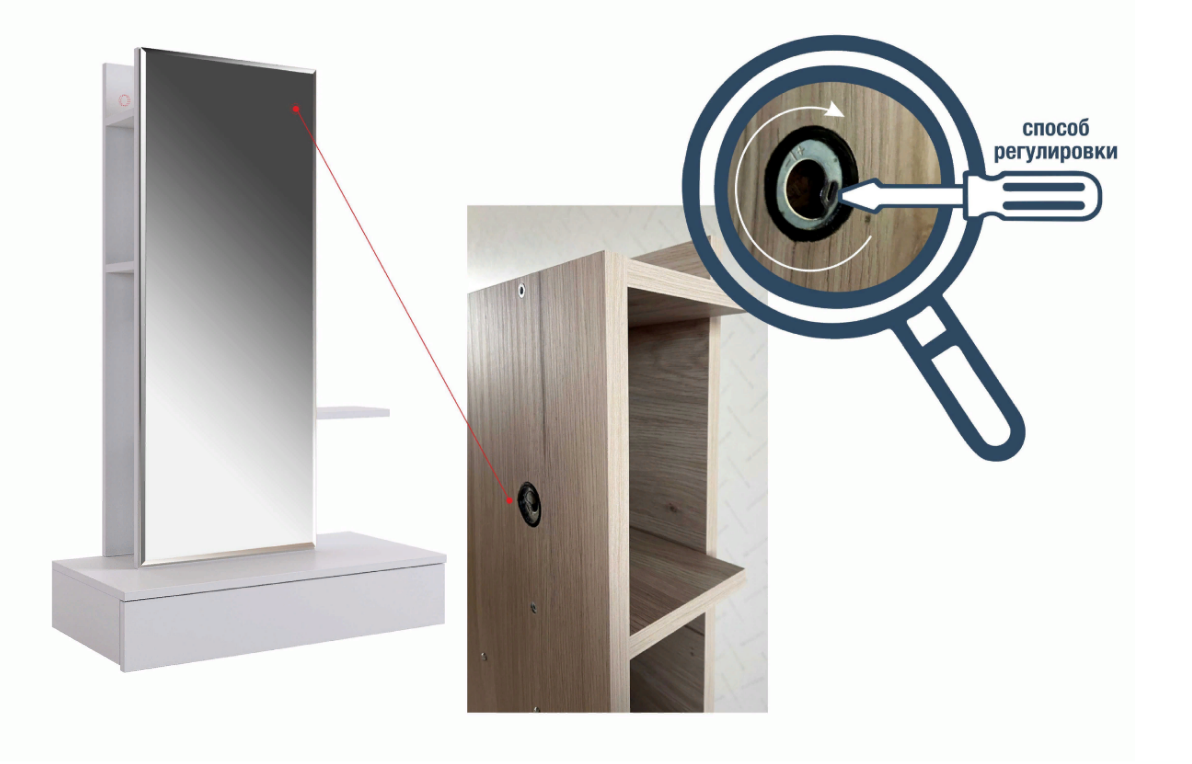 Способы установки полок смотреть в паспорте при сборке. Рядом с полками на задней панели предусмотрены стильный крючок для украшений или фена.